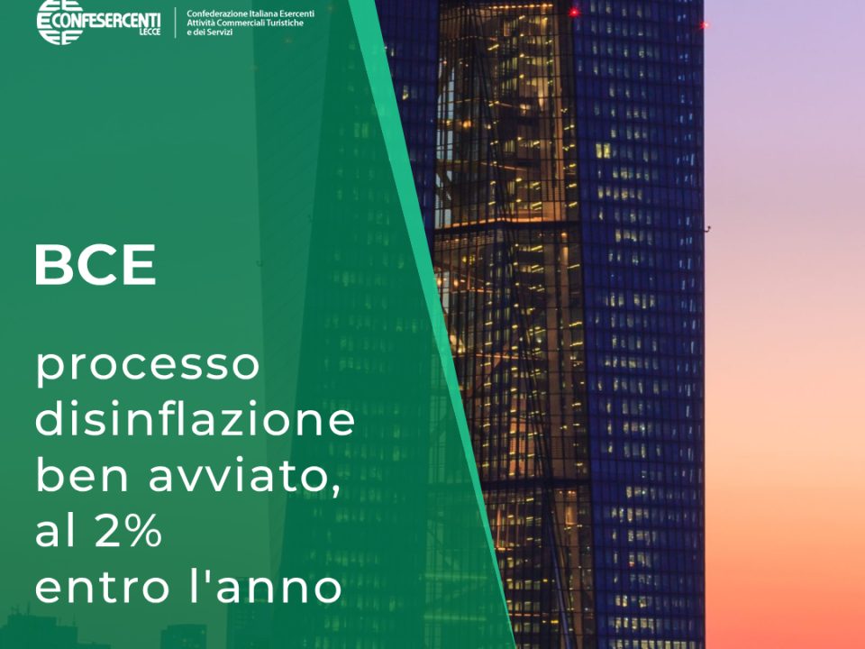 Bce: processo disinflazione ben avviato, al 2% entro l’anno