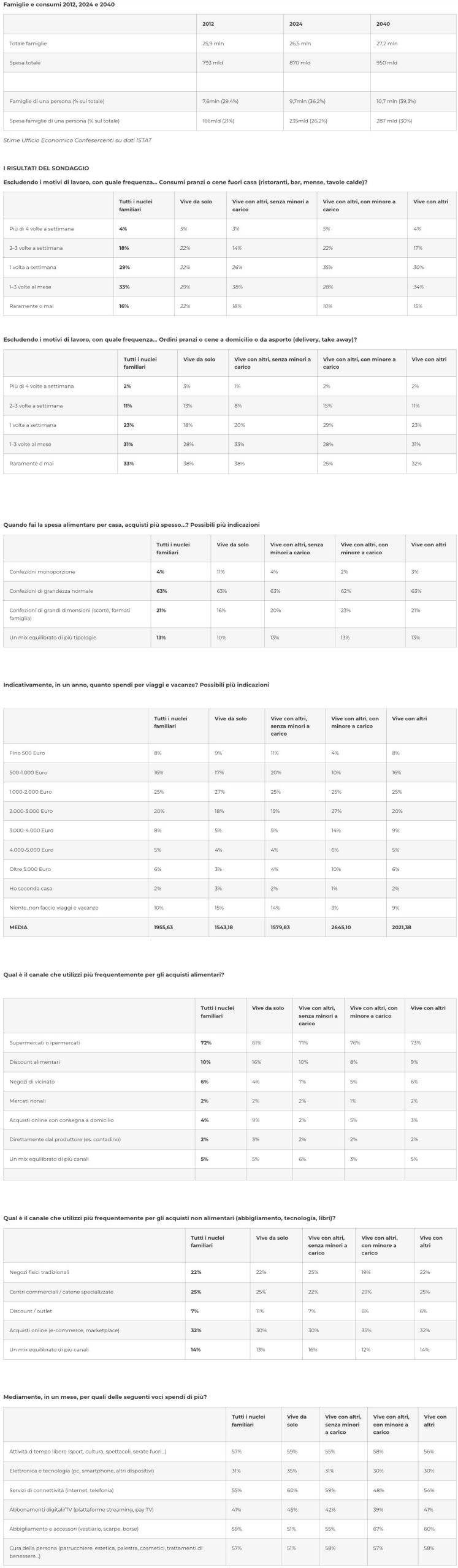 Cambia anche il servizio delle imprese di vicinato. Allo stesso tempo, il peso crescente dei consumatori soli sta già ridisegnando l’offerta del retail: più formati ridotti, packaging dedicati, servizi di consegna e opzioni digitali stanno diventando parte integrante della distribuzione.