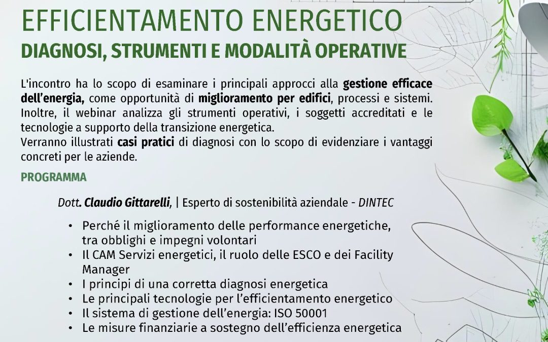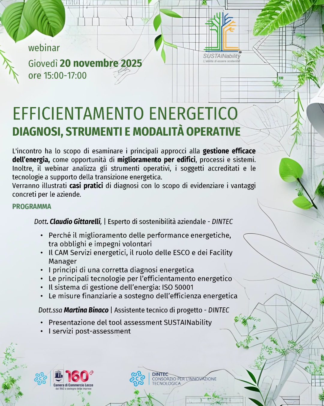 Nell’ambito delle attività promosse dall’ Ente camerale in materia di sostenibilità energetica, giovedì 20 novembre, a partire dalle ore 15.00, si terrà un webinar su “Efficientamento energetico: diagnosi, strumenti e modalità operative”. L ‘incontro ha lo scopo di esaminare i principali approcci alla gestione efficace dell’energia, come opportunità di miglioramento per edifici, processi e sistemi. Inoltre, il webinar analizza gli strumento operativi, i soggetti accreditati e le tecnologie a supporto della transizione energetica. Verranno illustrati casi pratici di diagnosi con lo scopo di evidenziare i vantaggi concreti per le aziende. Nell’ambito del webinar ci sarà la presentazione del tool assessment SUSTAINability, la piattaforma che permette di conoscere e migliorare la sostenibilità ambientale, sociale e di governance della tua impresa, un aspetto fondamentale per il presente ed il prodsdsimo futuro.