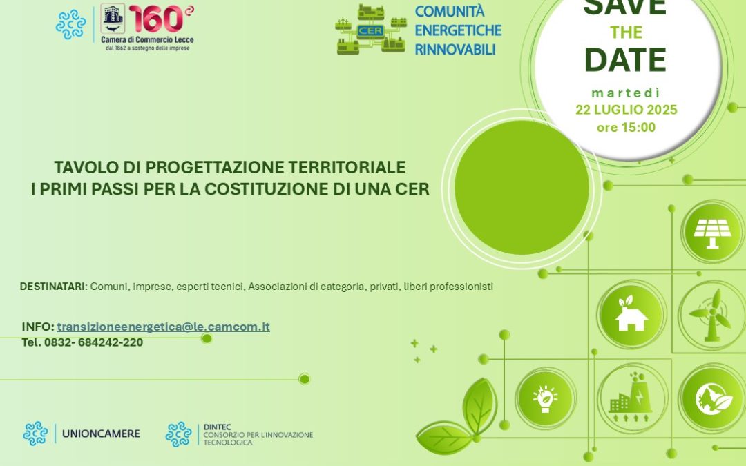 In tale ottica la Camera di commercio di Lecce procede nell’ attività di promozione prevista dal progetto “La transizione energetica” realizzato dall’Ente camerale, con il supporto tecnico di Dintec, società in house del sistema camerale, per cui martedì 22 luglio alle ore 15.00 si terrà, in modalità online, il primo incontro del Tavolo di progettazione “I primi passi per la costituzione di una Comunità Energetica Rinnovabile”.