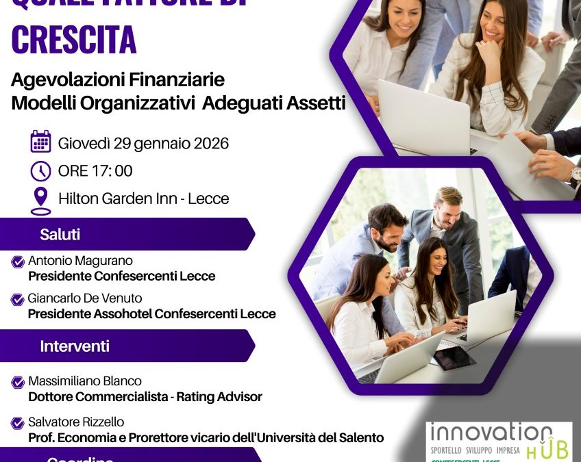 Il progetto sarà presentato ufficialmente durante l’incontro “La cultura d’impresa quale fattore di crescita – Agevolazioni finanziarie, modelli organizzativi, adeguati assetti”, che si svolgerà giovedì 29 gennaio 2026 alle ore 17:00 presso l’Hilton Garden Inn di Lecce. L’evento prevede la partecipazione di Confesercenti Lecce, Assohotel Confesercenti, Università del Salento, Camera di Commercio di Lecce e PR Consulting.